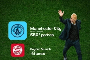 此役將是瓜迪奧拉執(zhí)教生涯帶隊(duì)參加的第1000場(chǎng)比賽,曼城官方社媒曬出瓜帥執(zhí)教場(chǎng)次的分布。