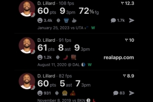 其中張伯倫第一多,他一共有32次,科比有過6次,而利拉德排名第三,他有過5次60+得分經(jīng)歷。