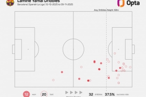 Opta指出,10月12日以來(lái),亞馬爾聯(lián)賽嘗試過(guò)人32次,與圖盧茲球員博霍并列五大聯(lián)賽最多,過(guò)人成功率37.5%。