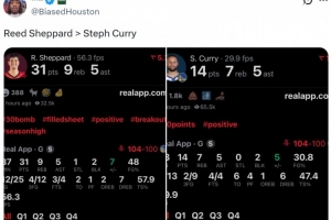 賽后火箭媒體人@BiasedHouston曬出謝潑德和庫里本場數(shù)據(jù),寫道:“謝潑德>庫里?!?/p>