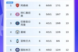 6輪過(guò)后,阿森納6戰(zhàn)全勝領(lǐng)跑,基本鎖定前8席位,曼城升至第4,皇馬跌至第7,本菲卡兩連勝靠近附加賽區(qū),重燃晉級(jí)希望。