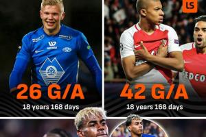 18歲的哈蘭德當(dāng)時還在挪威的莫爾德效力,他18歲168天時在職業(yè)賽場上的直接參與進(jìn)球數(shù)為26球;同齡的姆巴佩正在摩納哥效力,他當(dāng)時的直接參與進(jìn)球數(shù)為42球。