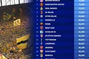 體育資訊12月29日訊 德轉(zhuǎn)發(fā)布2025年歐洲俱樂部場(chǎng)均上座率排行,多特第一、拜仁第二、曼聯(lián)第三。