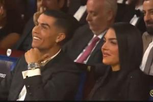 這句話引得臺下的C羅露出滿臉笑容,他身旁的喬治娜也微笑鼓掌。