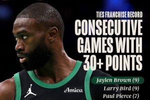凱爾特人官方曬出統(tǒng)計(jì),杰倫·布朗連續(xù)9場比賽砍下30+,追平拉里·伯德保持的隊(duì)史紀(jì)錄!