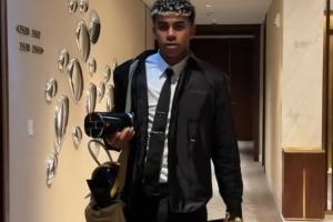 亞馬爾獲得的三項(xiàng)環(huán)足獎(jiǎng)項(xiàng)分別是為最佳前鋒獎(jiǎng)(被亞馬爾裝在包里)、馬拉多納獎(jiǎng)(頒給最有天賦的球員,亞馬爾拿在左手)以及西甲最佳U23球員獎(jiǎng)(亞馬爾右手)。
