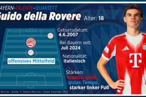 圭多·德拉羅韋雷,這位18歲的攻擊型中場身材高大卻技術細膩,被譽為“擁有細膩的左腳技術”。作為拜仁U23主力,他在地區(qū)聯(lián)賽中交出了4球9助攻的數(shù)據(jù),身價在一年半內增長了六倍。