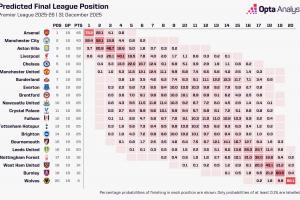 opta預(yù)測(cè)英超奪冠概率↓