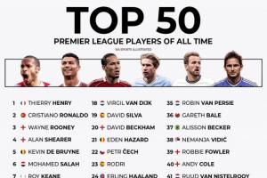 你認可嗎??外媒評英超歷史50大球星:亨利第1 C羅第2 薩拉赫第6