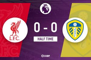 上半場(chǎng)補(bǔ)時(shí)2分鐘,利物浦0-0利茲聯(lián)。