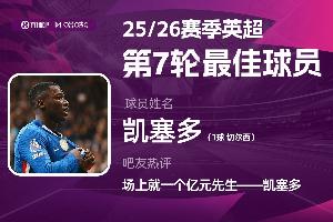 2025-2026賽季英超火熱進(jìn)行中,體育資訊和咪咕體育聯(lián)合發(fā)起每輪英超最佳球員評(píng)選活動(dòng)!第7輪評(píng)選結(jié)果出爐,切爾西后腰凱塞多攻防兼?zhèn)?,轟入世界波幫助切爾西2-1戰(zhàn)勝利物浦,獲得吧友5.6萬(wàn)票的支持,當(dāng)選 【體育資訊X咪咕體育英超第7輪最佳球員】!